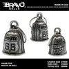 素材:ピューター合金(錫) 付属品:ポーチ 英語説明書  本物のアメリカBRAVO BELLS社製ガーディアンベルです。 MADE IN USA アメリカ製 交通安全 魔除け 御守り ガーディアンベル アメリカのライダーの間には、事故や、転倒の原因は「道路にひそむ悪魔」によるいたずらだという伝説があります。悪魔は走る者に悪戯やトラブルを運んできます。このベルは美しい音色で悪魔たちを追い払うと言われ愛されています。そんな悪魔のいたずらを防ぎ、御守りとなるのが、守護者のベルという意味を持つガーディアンベル。日本でも鈴の音(ね)は神道では魔除けの音と言われています。ピューター製の鈴でいい音色でガーディアンベルはデザインも様々あります。またガーディアンベルにまつわる伝説として、プレゼントとして送られたベルの効果は、自分で手に入れたものの2倍になると言われています。 それゆえに彼氏・彼女・友達・家族へのプレゼントとしての人気も非常に高まっています。シルバーアクセサリーのようにおしゃれに装着できて素敵な音色を奏でるガーディアンベル。バイカー以外にも自転車や旅・交通安全のお守りとしてお使いいただけます。カバン・ランドセル・キーホルダー・ペットの首輪等に付けてお使いください!!※タイラップ等でバイクのフレームにも簡単に取り付けできます。 アメリカンモデルだけではなく、旧車ファン、レプリカライダーまで、さらにバイクだけでなく、自転車や車にもピッタリな御守りとなっています。アクセサリーとしても人気で、アイディア次第で車体だけでなく、キーホルダーや鞄など、どこにでも付けておしゃれに楽しめます。