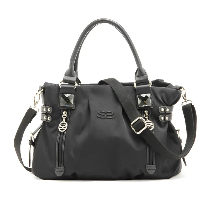 ポリエステル素材のバッグ。シンプルデザインにキラリと光るビジューがポイント♪取り外し可能なベルト付きでコーデを選びません!マグネット式■ポケット/(内側)ファスナー×1、オープン×2、中央仕切りファスナー×1(外側)前ファスナー×2