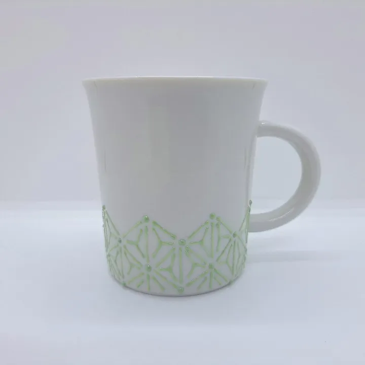 九谷伝統技法「盛」。いっちんと呼ばれる独自の道具を使用して絵具を先端から絞り出し立体的に描きます。麻の葉模様を「盛り」上げて表現されています。 電子レンジ:温め程度可 食洗機:使用不可