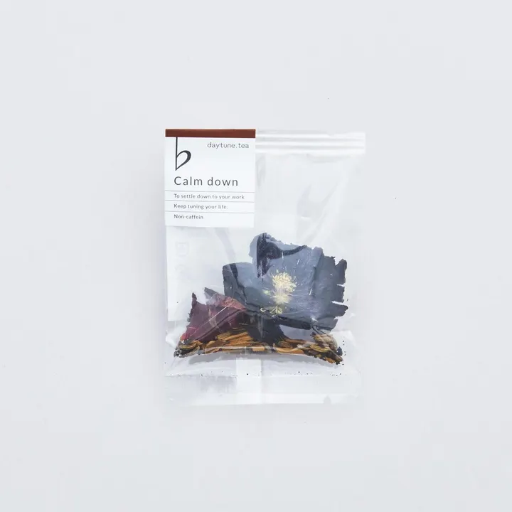ヨーロッパ等でノンカフェインコーヒーとして飲用されるチコリに、落ち着きをもたらすシナモン、優しく香るローズを組み合わせました。ほど良いリラックス感で、落ち着いて仕事に取り組めるハーブティーです。 ・落ち着くためのブレンド Calm downブレンドは、深く落ち着きたいときのための、コーヒーのような苦味のある焦げ茶色のティー。香ばしさとコクを演出するために、焙煎したチコリの根の苦味を生かしつつ、シナモンやフェンネルシード等のスパイスハーブの複雑な風味をプラスした、上品で落ち着いた味わいのブレンド。 セイロンシナモンの繊細な香りと、バラの華やかな優しさ、ブラックマロウのとろみと見た目のインパクトも魅力。 ・素材へのこだわり 上品な香りを表現するシナモンは、一般に流通するカシアではなく、繊細な香りが楽しめる「真のシナモン」と呼ばれるセイロンシナモンを使用。スティック状のものを仕入れてから香りが立つようカットしています。 チコリは様々な種類を飲み比べて、焙煎が適切で香ばしさがありつつ、焦げくさくないものを選んで仕入れ。珍しいブラックマロウは、花首(花そのもの)の状態で丁寧にドライにしている国産のものを使用しています。 ・じっくり取り組みたい時に やっと自分の時間を確保できたので、この機会にあたためていた企画の仕事をすることにした。今回は、急いでアイデアを固めるのではなく、まずはリサーチからしっかりはじめたいな。そうと決まれば机を軽く片付けて、ノートやペンなど、必要なものを準備する。 作業のお供にティーを淹れたら、深く座りなおして、肩の力を抜いて取り掛かる。気付いた時には没頭していて、そういうときに出てきた気づきや発見が、いいアイデアになったりする。 〈ティーバッグについて〉 daytune.では、素材にもこだわってプロダクトをつくっています。ブレンドしているハーブについては有機・農薬不使用のものを代表自らが一つひとつ、味や品質を吟味して選定。ティーバッグは、生分解性成分であるトウモロコシ由来のソイロンを素材としたものを使用しています。 土に還せるのはもちろんのこと、燃やしても有害な物質が出ません。環境への配慮になるだけでなく、ティーもより本来の味が楽しめます。daytune.が持続可能性を大事にするブランドであるために、できることから取り組んでまいります。