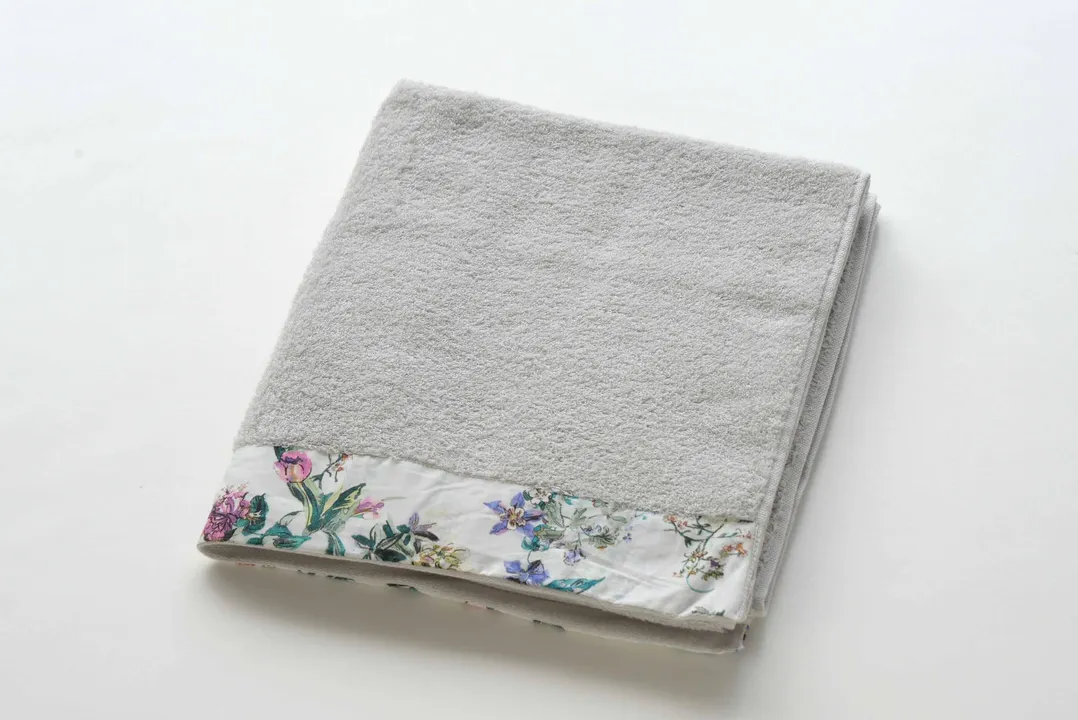 インクジェットの花柄プリントが魅力のバスタオル。 60×130cm、綿100%、日本製、 ヘム部分の鮮やかな花柄プリントが印象的な、エレガントでフェミニンなタオルです。しっとりやわらかな肌ざわりと、洗うほどふっくらやわらかくなるタオル生地。可憐さと力強さを感じさせる花柄がよく映えます。 今治タオルブランド認定商品