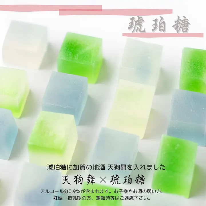 外側はやや硬くてシャリっとしており、中はぷるっとした食感の琥珀糖。 石川県白山市の蔵元 車多酒造と、同じく白山市の老舗和菓子屋 彩霞堂がコラボした大人のお菓子。 青色から緑色、そして白色までのグラデーションが涼しげな「天狗乃琥珀」 カリッと噛むと甘く、徐々に日本酒の香りが広がります。 加賀の地酒 天狗舞を使用した、大人の琥珀糖です