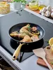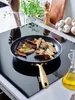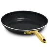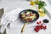 ノンスティック・セラミックコーティングが施され、熱伝導に優れたこびりつきにくいフライパンです。丸みのあるハンドルは中空になっているので軽く調理やお手入れをしやすい点も嬉しいポイントです。ブラックのボディとゴールドのハンドルの上品なデザインは調理後そのまま食卓にサービングするのもおすすめです。