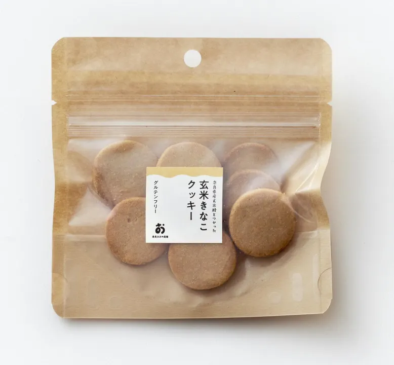 きな粉の香りが香ばしい!大人の女性人気のクッキーです! グルテンフリーでの「小麦粉・卵・乳製品・白砂糖なしの」7大アレルゲン不使用クッキーができました。 玄米粉だからきな粉の香りが香ばしく、豆乳も使ったホロホロな食感に仕上がっています。グルテンフリーなのに美味しいね、とお声をいただいています。 みんなで集まる場で「アレルギーの方だけ別々のおやつ」にさせず「みんなで同じものを食べる」ことができます。子供は楽しく、お母さんは安心して食べさせたいですよね。 小麦粉、乳、卵、白砂糖不使用なので、ヴィーガンスイーツを探している方にも食べていただいています === ●お客様の声 きな粉の風味がとても豊かで、シンプルに美味しいです。重たさがないので次々と手が出て止まらなくなるので、あっという間に食べ切ってしまいました。 昔米粉クッキーを食べた時はあまりいい印象ではなかったのですが、これはむしろ普通の小麦粉クッキーより好きかもしれません。 ちょっと高いかなと感じましたが、これだけたくさん入っているので大満足でした。 ●お客様の声 香ばしいきな粉クッキー、安心な素材であるうえに、美味しくて。 今回も娘と、やっぱり美味しいね〜と食べてます。 送料がお安いのもありがたいです。 ●お客様の声 甘さ控え目で、きな粉の風味が感じられて、後をひく美味しさですね。 グルテンフリーも嬉しいです。 ●お客様の声 先日はたくさんのお菓子をお送りいただきありがとうございました。 ・使用している食材がシンプルで、マーガリンといった油脂取りすぎの心配もないので、安心して与えることができますね ・子供の持ちやすい・食べやすい大きさなので嬉しい、カバンの中で割れてしまうことも心配しなくて良いので◎ ・味はシンプルで素朴な素材の味。安心して食べさせられる。 ・クッキーの堅さも全く問題なく、食べていました。 □原材料名: 玄米粉(奈良県産ヒノヒカリ)、きな粉、きび糖、豆乳、米油。 (※本品製造工場では、小麦、乳、卵を含む製品を生産しています。) □内容量:【1袋8枚】 簡易包装 □賞味期限:製造日より210日 □アレルギー表示対象品目:7大アレルゲンなし □保存方法:直射日光・高温多湿を避けて。保存してください。 □販売者 :奈良おおの農園 大野收一郎 □栄養成分表示 1袋8枚当たり エネルギー 165kcal タンパク質 3.8g 脂質 8.4g 炭水化物 18.6g 食塩相当量 0.01g (このお菓子は、福祉施設の方々に、私の考えをご理解共感いただき 就労支援利用者様にお一人お一人の得意を活かして優しく丁寧に製造していただいております。 本事業は農福連携のひとつのカタチになっております。)