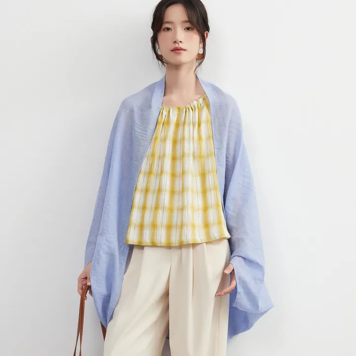 特徴 この2WAYシアー綿混カーディガンは、多機能なデザインが特徴です。カーディガンとして羽織ることもでき、またストールとしても使えるため、さまざまなシーンで活躍します。軽量で通気性が良く、陽射し対策や冷房対策に最適です。たためてコンパクトに収納できるため、持ち運びにも便利です。 生地の特徴 高品質な綿混素材を使用しており、肌触りが柔らかで通気性に優れています。シアーな透け感があり、夏の暑い日でも涼しく快適に過ごせます。シワになりにくく、軽量でありながらも耐久性があるため、日常使いにぴったりです。 コーディネートの提案 このカーディガンは、様々なスタイルに合わせやすい万能アイテムです。カーディガンとして使用する場合、Tシャツやキャミの上に羽織ることで、カジュアルからオフィススタイルまで幅広く対応できます。ストールとして使う場合は、シンプルなトップスにアクセントを加えることで、おしゃれな印象をプラスします。また、バッグにたたんで入れておくと、外出先での急な陽射し対策や冷房対策にも役立ちます。 単位(cm)モデル身長165cm サイズ FREE  カーディガンとして:着丈 70~90 バスト 136  ストールとして:巾50 長さ136 素材:ポリエステル80% 綿20% 中国製 透け感:あり 生地の厚さ:薄い 光沢感:なし 裏地:なし 家庭洗濯:可能(ネット使用) 【注意点】 ※撮影商品はサンプルの為、実際の仕様と異なる場合がございます。 ※画像の商品は光の照射や角度、お使いのモニター環境により、実物と色味が異なる場合がございます。スタジオ物撮りの画像が実物の色味に一番近くなっております。 ※予約商品の場合、お届け予定はあくまでも目安となります。 生産の都合上、お届け時期がずれる場合がございますので、あらかじめご了承ください。 ※表記サイズは商品の実寸です。 ※布製品の特性上、サイズ表の実寸法は多少の誤差が生じる場合がございますので、予めご了承ください。