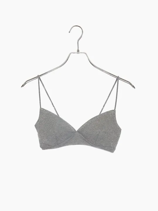 伸縮性に優れたオーガニックコットンのフライス生地を使用したブラトップ。 ストレスフリーな着用感ながら、アンダー部分にはストレッチテープをあしらって、アンダーバストから体のラインにそってずれにくいのが特徴。 バスト全体を包み込む安心感のある着心地のため、ソフトブラ初心者や、フィットネス時にスポーツブラとして着用することもできます。 カラーは、低刺激反応染料で染めたグレーとナチュラルの糸を編みたてた「杢グレー」。 ・バストパット取り外し可能 ・肩紐にアジャスター付き ショーツ WLS014B とセットアップが可能です。