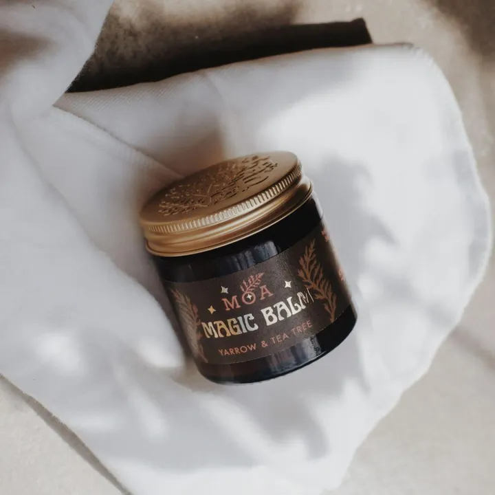 「MAGIC BALM」は、古来より癒しのハーブとして知られるヤロウと、ティーツリーオイルを主成分としたマルチバームです。肌の乾燥やトラブルにやさしく寄り添い、日々のケアに自然の恵みをもたらします。 Key Features 整える植物「ヤロウ」配合 古代から癒しのハーブとして知られるヤロウ(セイヨウノコギリソウ)を中心に、肌と心を穏やかに整えます。 多機能な使い心地 クレンジング、保湿、マッサージ、トリートメント、アフターシェービング、バストケア、オムツかぶれ、アフターサンケアなど、これひとつでお肌のトータルケアが可能です。 高い保湿力と浸透性 バーム特有のベタつきがなく、体温でオイル状に変化し、なめらかに肌へ浸透します。敏感肌や赤ちゃんにもおすすめです。 〈使用方法〉 【スキンケア】 洗顔後、適量を指先に取り、体温でじっくりと肌へ浸透させます。乾燥やごわつきが気になるときは、ミストで整えてからバームを馴染ませ、仕上げにフェイスオイルをプラス。 【スペシャルケア】 バームを手に取りバスタブへ。ゆっくりと馴染ませながらマッサージ。バンブークロスをお湯でしぼり軽く蒸すようにお顔を温めたあとふき取ってください。肌のごわつき、ざらつきがオフされてスキンケア成分が浸透します。 【ベビーケア】 沐浴後、入浴後に軽く水分をオフした状態でお顔、体、またオムツかぶれが気になる箇所に両手で包みこむように広げてください。驚くほどの浸透力で肌へ素早く馴染みます。 【ママケア】 産後のストレッチマーク、乳頭ケアにも。 【ヘアケア】 指先に適量とり、手の平で温め毛先へ馴染ませるとパサつきを抑えてまとまったヘア状態に。つやっぽい仕上がりにしたい場合は、さらにバームを手にとりかき上げるようにスタイリング。 【のどのケア】 気管支系の不調に効果的とされるティーツリー配合のバームは、ぬるま湯に溶かしてうがいをするのもおすすめです。花粉症等ののどのイガイガや、インフルエンザ等の予防対策に。