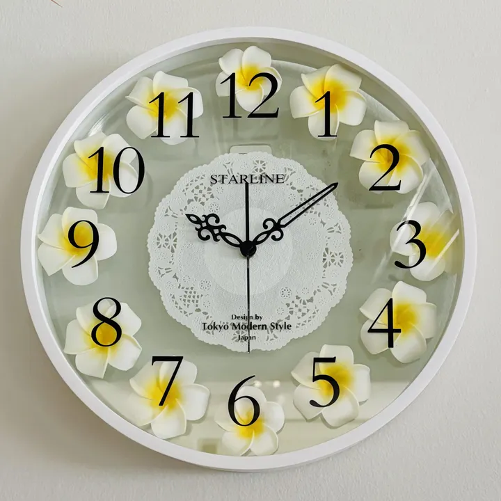 3枚のクリアなガラスに可愛い黄色いプルメリアの造花を挟んだ、当店人気のかわいくておしゃれな掛け時計です。 飾れば南国の雰囲気に。お部屋が明るくなります。 どんなインテリアにも調和し、日常を彩るアートピース。時間の経過を優雅に告げるこの時計は、目にするたびに笑顔を運びます。 リビング、寝室などはもちろん子供部屋でも可愛い! またプルメリアには「気品」「親愛」「魅力」という花言葉があります。 母の日、誕生日、開店祝い、記念日など様々なシーンのプレゼントにも最適です。 ぜひこの機会にご利用くださいませ。