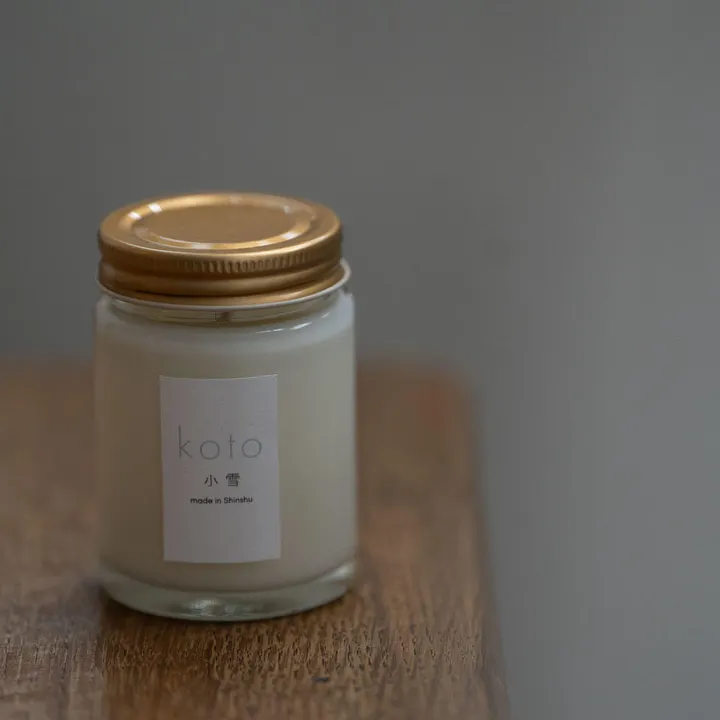 こちらのminiサイズはご自宅で手軽に灯していただけるよう、蓋付きの瓶入りの少し小さいサイズとなります。 kotoの自社アトリエで作る四季巡る二十四節気のキャンドルは、厳選した原材料を配合し、ブレンドや調合、箱詰めまで一点一点職人の手によって心を込めてしつらえています。 大豆とアブラヤシの天然ワックスを独自にブレンドし、香りの拡散と持続、燃焼効率に優れたハンドメイドキャンドルをお届けします。 雪が舞いはじめる頃――小雪。 冷たい北風が木々の葉を散らし、橘の実をはじめとする柑橘類が黄色く色づいていきます。人々はお世話になった方への感謝を込め、「お歳暮」の準備に取りかかる季節でもあります。 「小雪の香り」は、甘さとスパイスが溶け合ったフレグランス。アーシーで重厚な香りはどこか神秘的 な存在感を放ちます。 香りは、トップからミドルにかけて甘みとスパイスが複雑に絡み合い、濃厚で陶酔感のある印象を描き出します。 やがてベースノートでは、シダーウッドとパチュリが深いウッディの落ち着きを添え、安定感のある余韻へと導きます。全体を通して、神秘的で少し妖艶な雰囲気を漂わせるのが特徴です。 配合されている天然精油は、シダーウッドとパチュリが重厚な土の気配を、クローブがスパイシーな力強さを、オレンジが明るいアクセントを加え、香りに豊かな表情をもたらします。 澄んだ空気と暖炉のぬくもりが重なり合い、心をやさしく解きほぐし、冬の日常に安堵のひとときを添えてくれるような香りです。 二十四節気の移ろいに寄り添うように、kotoのキャンドルはすべて厳選された原材料を用い、自社工場で一点一点、手作業で仕立てています。ワックスの配合や芯の細部に至るまで丁寧にこだわり、美しく灯りと香りを楽しんでいただけるよう心を込めています。朝の始まりから夜のひとときまで、季節の気配を感じる香りが日常に溶け込み、暮らしのリズムにそっと寄り添ってくれます。 【使用上の注意】 灯している時はキャンドルのそばから離れないようにしてください。一度に2時間以上の燃焼はおやめください。長時間燃焼すると、グラスが大変暑くなり破損する恐れがあります。芯が長くなったり曲がったりすると火が大きくなったり、黒い煙が出やすくなります。灯す前に芯を7mm程度にカットし、整えてください。お子様やペットの届くところでの燃焼はおやめください。サイズ選択数量 カートに追加する ご使用方法 ----- 1. 灯している時はキャンドルのそばから離れないようにしてください。 2. 一度に2時間以上の燃焼はおやめください。長時間燃焼すると、グラスが大変暑くなり破損する恐れがあります。 3. 芯が長くなったり曲がったりすると火が大きくなったり、黒い煙が出やすくなります。灯す前に芯を7mm程度にカットし、整えてください。 4. お子様やペットの届くところでの燃焼はおやめください。