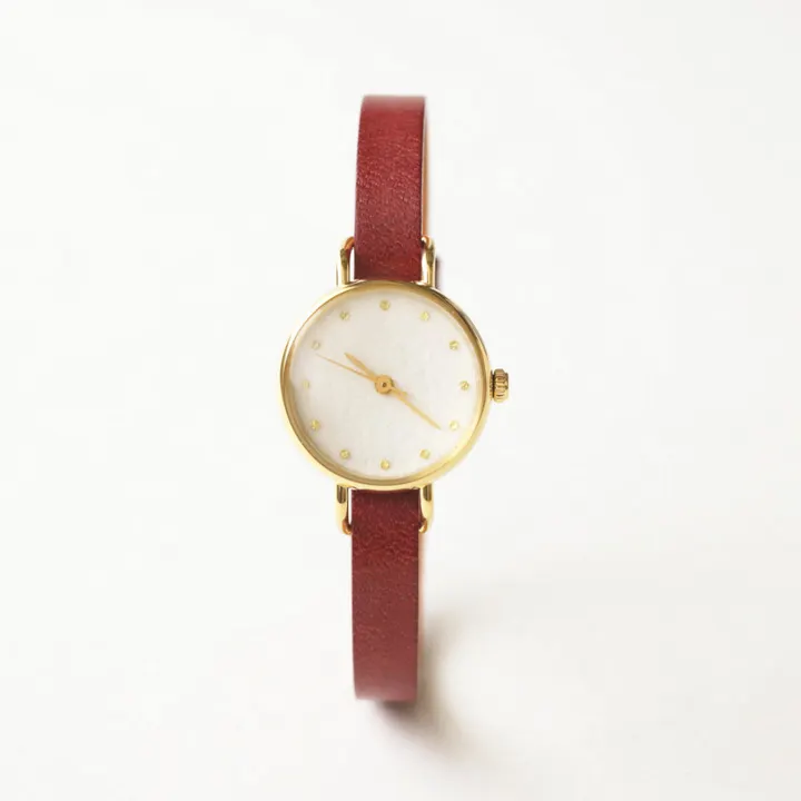 天然の水晶を砕いて作った「岩絵具」を文字盤に塗った腕時計です。 「岩絵具」は、日本画を描く際に用いられ、7世紀ごろ高麗の僧が紙や墨とともに日本へ伝えたといわれている、 主に天然の鉱物を砕いて作る絵具です。普通の絵具にはない、透明感ある色彩と、粒子が粗くザラザラとした独特の質感をお楽しみいただけます。 ■ベルトサイズはレディース(手首周り15-16cm対応)を基準に制作しています。 【仕様】 ■素材 / 時計本体(日常生活防水):ステンレス、強化ガラス ベルト:牛革、ステンレス ■サイズ / 文字盤:直径22mm(リューズ部分含まず)、厚さ7mm、幅約0.7cm ベルト:内周約13.5~17cm(7段階調節可能) ※ベルトを含む腕時計の重量:約12g ※ベルトの色:No.38 ボルドー ※ムーブメント:クオーツ式(セイコーエプソン社製、国産) ※保証書付き(一年間) ※ベルトは、レディースサイズ(手首まわり14.5~16.5cm)を基準に製作しています。 ※文字盤は天然素材を使用し、手作りですので個体差があります。 ※ベルトは、本革のため、表面に独特のしわや凹凸、多少の傷・光沢・色ぶれ・色むらなどが出ることがあります。