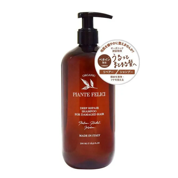 <ダメージヘア用> *フルーティーフローラルノートの香り *枝毛などのダメージが気になる方へ オレンジ精油やゼラニウム精油を基調としたフルーティフローラルノート。 リンゴやピーチ、ジャスミンなども加わり上品なフラワーブーケのような香りです。香り華やぐバスタイムに。 ■ピアンテフェリーチ4つのポイント 1)AIABのオーガニック認証を取得 日本には、オーガニックを認定する法的な基準がありません。 だからこそ本物のオーガニックにこだわり、サスティナビリティの高い植物原料を使用し、環境や人体への影響を配慮しました。 AIAB(イタリアのオーガニック認証機関)のオーガニック認証を取得しています。 2)良質なオーガニックを手の届く価格で 日常生活の中に”オーガニック”が溶け込み、そして継続的に使っていただきたいという強い想いを込めて。 通常の生産プロセスを見直し、中間コストを徹底的に省きました。 さらに、一般的な利益構造の概念も覆すことで、本当の意味での「高品質・低価格」を実現しました。 3)イタリアの素晴らしい生産背景 山の恵み、海の恵みが融合する街、イタリア・ジェノバ。 美しい自然豊かな森の中にひっそりと佇む工房で生産しています。 世界有数のオーガニック製品の生産を担っているため、こだわりの原材料を用い、環境にも人にも配慮したサスティナブルな製品を追求しています。 4)香りにとことんこだわり抜きました ラグジュアリーブランドのパフュームやディフューザーを手掛ける工房なので、とにかく香りに自信があります。 それぞれの製品の目的に合わせ、幾度となく調合を繰り返してもらいました。 自然の恵みを生かしつつ、複雑で、爽やかな残り香が魅力の芳香を実現しました。 “ずっと使いたくなる”安心と満足 ・No Parabeni(パラペン)肌に刺激のある防腐剤 ・No Paraffina(パラフィン)スキントラブルが懸念される物質 ・No PEG(ポリエチレングリコール)スキントラブルが懸念される物質 ・No Oil Minerali(石油鉱物)スキントラブルが懸念される物質 ・No OGM(遺伝子組み換えではない) ・No SLS(ラウリル硫酸Na)硫酸系合成界面活性剤 ・No SLES(ラウレス硫酸Na)硫酸系合成界面活性剤 ・No DEA(ジェタノールアミン)肌への刺激が懸念される ・No Siliconi(シリコーン)