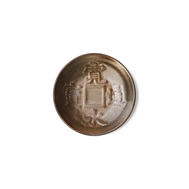 寛永通宝は江戸時代に長く広く流通していた銭貨。それが小皿になって令和の時代にタイムスリップ。 彫りの凹凸により立体感があるデザインになっています。表面の金彩、銀彩らが上品にお料理を引き立たせる小皿です。 金や銀の入った食器というと敬遠されがちですが、このお皿は落ち着きのある品の良い風合いで、一品料理がとても盛り映えします。