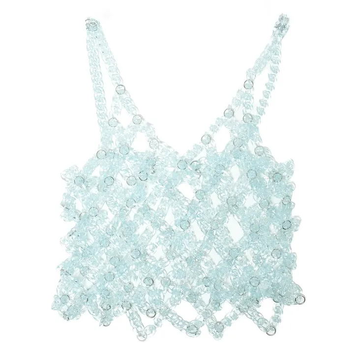透明度の高い高品質なアクリルチェーンを丁寧に1つずつ繋いで作ったチェーンビスチェです。 接続部分はステンレスの二重リングを使用し、強度と高級感を出しています。 ガラスのような透明感と光沢が見とれるほどの美しさを醸し出しています。 カジュアルなTシャツやカットソーの上に着用すればスタイリングのアクセントになり、 シャツやブラウスの上に着用すればドレスアップされる、 存在感がありながらも使い勝手の良いアイテムです。 チェーンは簡単に取り外せますので、肩ヒモ部分の長さはご自身で調整して頂けます。 ---MADE IN JAPAN--- 品番:CH2405-004