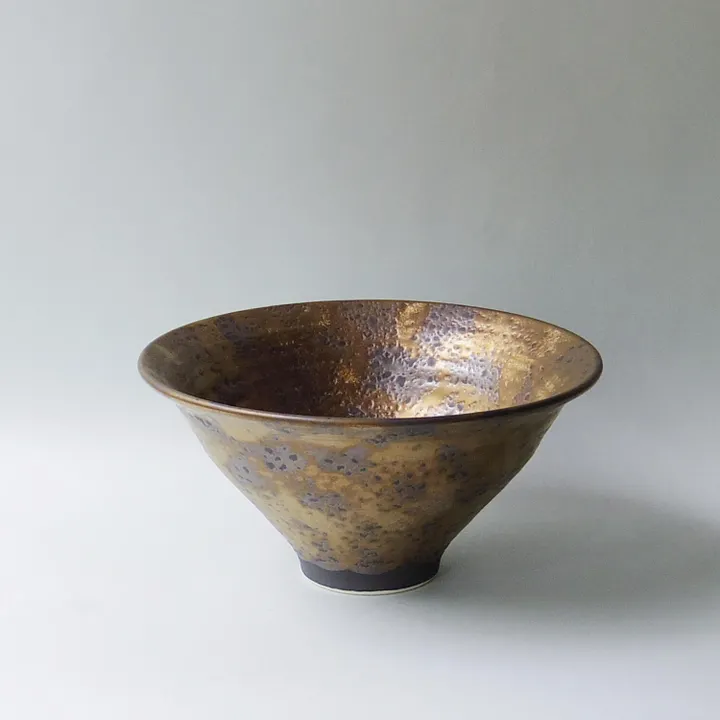 シックながらインパクトがある仕上がりの「金叩き」は、真っ赤な辛味の効いたラーメンが似合います。 黒地を塗った後に、金色の絵の具を手作業で勢いよく仕上げています。 麺はもちろんサラダなどの盛り鉢としてもテーブルを華やかにしてくれます。 ■翔武窯 土岐市駄知 ホテル、レストラン、飲食店などで使われる業務用食器を中心に製造している窯元。ありながら使いやすいうつわは、食のプロにサポートされ続けています。