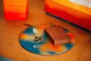 インテリアにも料理のプレートにもにご使用可能です。 石川県加賀市の加佐の岬から見る夏の終わりの夕焼けが反射して海の色と混ざり合ったデザイン。橙のグラデーションと海に差し込む光の変わり塗の両面塗装となっています。お好みに合わせたカラーてお使い分けてみてはいかがでしょう