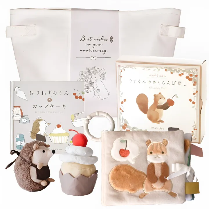 生まれてきた赤ちゃんはもちろん、家族みんなに贈るセットとして… ストレージボックスの中にはりねずみくんとカップケーキとふんわりえほんを詰め、熨斗風ラッピングを施したギフトセットです。 撥水コーティングがされたストレージはオムツやおもちゃ、お洋服など、物が増えがちな育児のアイテムを収納できるので贈られた後も大活躍のアイテムです。