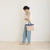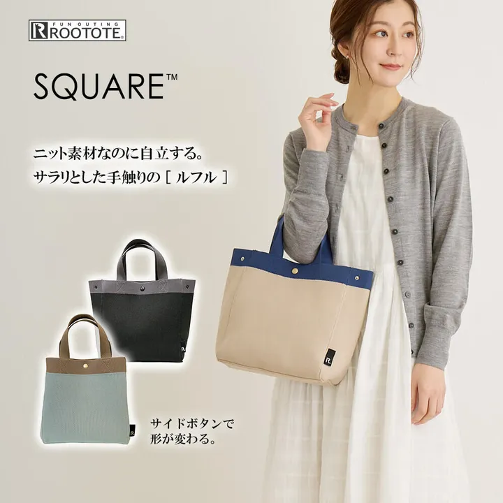 素材をフル活用したルートート「ルフル」。 サラリとした手触りは暑い季節にもベタつかず、快適。 ニットなのにハリがあり、自立するのも魅力です! トートバッグのパターンにあわせて、パーツごとに生地を編み立てていきます。 製造時の端材が出ず、生地端の処理も不要。 無駄の少ない製法でつくられました。 必要な分だけパーツを用意し、素材をフル活用しました。 ポイントになる異なるカラーで配色したハンドル。 やわらかい色合いが癒されます。 シンプルなデザインと使いやすさ。 ちょっとした用事など身軽にお出かけできる便利サイズ。 長財布、スマホ、ポーチなど必要なものをしっかり収納してくれます。 用途に合わせてカタチをチェンジジ。 中のモノに合わせて、形が変えられるサイドホック付。 ホックを付けると、すっきりスタイルに。 ホックを外せば、たっぷり収納でき、モノの出し入れがしやすく、中身もパッと確認できます。 体に寄り添うやわらかさがありながら、自立するシルエット。 荷物が少ない時にも型崩れしにくくなっています。 内ポケットと背面にはルーポケット付き。 すぐに出したいパスケースやスマホなどの収納にピッタリ。 いつでも清潔に。 洗濯可能で、衛生的に安心してご利用いただけます。 季節を問わず大活躍です。