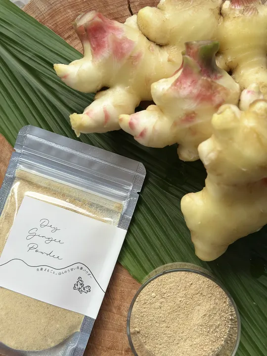 【生姜まるごと。 ひとさじで香りも風味も、芯から温まる】 農薬や肥料を使わずに育てた生姜を皮ごと丁寧に使用。 クラフトジンジャーシロップを搾った後の生姜を余すことなく乾燥・粉末にしました。 生姜の繊維もそのまま含まれている為、生姜丸ごとの力強い風味と香りが特徴です。 30g入りは生姜約300g・100g入りは約1kg分の生姜をパウダー状にしています。 パウダー状だから飲み物や料理に手軽に使えます。 少しの水分で戻せばおろし生姜のようにも使えます 【めぐる恵、生姜の第二章】 クラフトジンジャーシロップ作りで搾った後の生姜を最後まで美味しさで届けたい。 しぼりきった生姜も風味も美味しさもしっかり残っています。 そんな思いから残った生姜を乾燥させパウダー状にしたアップサイクル商品。 最後のひとかけらまで余すことなくいただく『めぐる恵、生姜の第二章。』 料理や飲み物にひとさじ 【からだ芯からあたたまる。生姜のちから】 古くから“自然のめぐみの薬箱“と呼ばれてきた生姜 生姜は加熱すると、生姜に含まれる成分「シンゲロール」の一部が「ショウガオール」に変化し、体を温める効果が高まります。 さらにクローブやカルダモンなどのスパイスも加わり、胃腸を助ける作用や代謝をサポートする働きもあり、日々の健康維持やリフレッシュにもぴったり。 リラックスしたい時、元気を出したい時、ちょっと一息つきたい時。 そんな毎日に、生姜のやさしい力をお届けします。 〈おすすめ使い方〉 ・紅茶や白湯にひと匙 ・お水を含ませるとおろし生姜に! ・生姜焼きやチャーハン ・お味噌汁やスープにも ※賞味期限が10ヶ月以上ある商品をお届けいたします