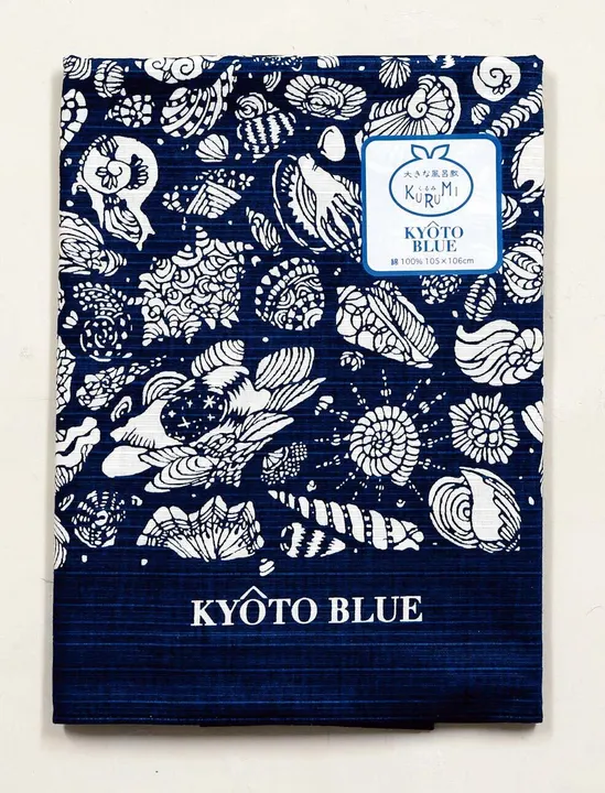 KURUMI(くるみ)シャンタン三巾風呂敷 しっかりとした素材のシャンタンを使用した、三巾サイズの大きな風呂敷です。荷物をくるんで風呂敷としてはもちろん、裾を結んだりしてバッグとしても活用できます。 くるんで掛けて結んで巻いて、インテリアクロスとしても… 幅広く活用できる風呂敷です。 「貝殻円文」水の都・京都をイメージして描いた「KYOTO BLUE」の、貝殻をモチーフにした商品です。東京藝術大学出身の作家による図案は、オリジナリティー溢れる独特なセンスが美しい風呂敷です。