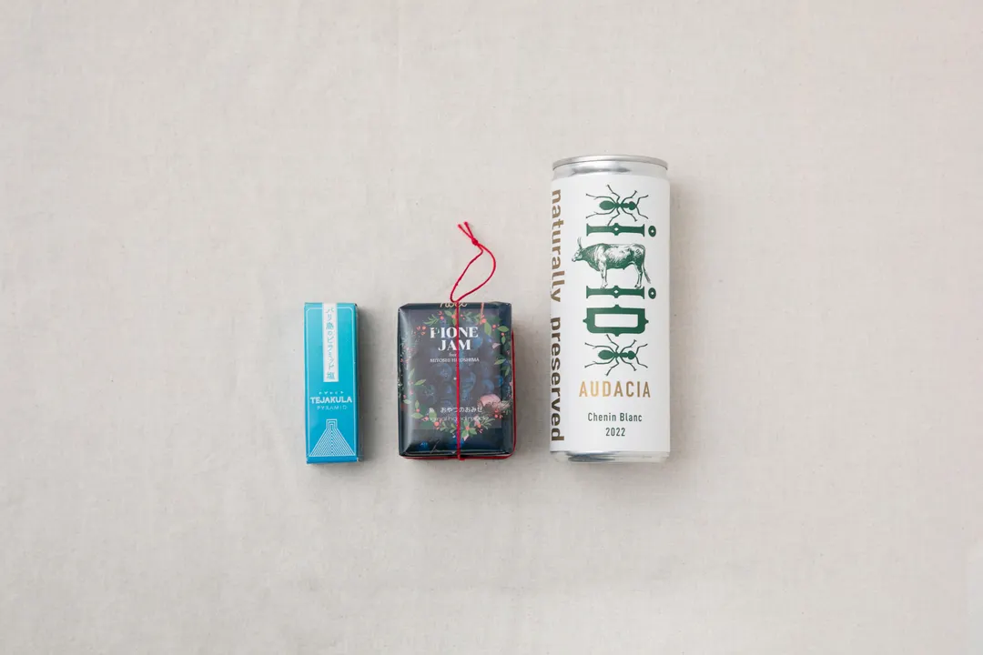 「今宵」をテーマにのんびり過ごす大人の夜時間。ジャムとワインで晩酌したあとは 自然の奇跡が作ったピラミッドパワーを感じて心身ともに浄化して、おやすみなさい。 ギフト内容(スペック) 「糸おやつのおみせ」ジャム(100g×1個) 「糸おやつのおみせ」のジャムは全ての工程が手作業です。銅鍋でじっくりコトコト煮込んだジャムは格別。ワインやお酒に合うジャムを作りました。種類は季節によって変更することもあります。 「アウダシア」ルイボスワイン(250ml×1本) 近年注目の産地・南アフリカで醸造。酸化防止剤・亜硫酸塩の代わりにルイボスとハニーブッシュ由来のタンニンの抗酸化作用を使用(世界特許)した自然派ワイン。缶を開けるとフレッシュな香りが広がります。 「TEJAKULA」ピラミッドソルト ピラミッドの形をした自然結晶塩。バリ島・テジャクラで500年以上続く塩田で伝統製法。ピラミッド型の塩は自然の条件が揃った時に出現。確率は全体の1〜5%とかなり希少。クリアリング、盛り塩、お守りに。 ----------コラボギフト誕生のきっかけ---------- 「糸おやつのおみせ」のジャムは添加物不使用。農家さんや産地、銘柄を明確に提示しています。 植物由来のものを使用しているのも特徴の一つです。 そして、環境や人に配慮することを心がけながら、品質の高いものを作り出すことを掲げています。 全国の展示会やイベントに地道に出展し続け、 「糸おやつのおみせ」に共感してくださる方と出会えました。 全国からお声をかけていただけるようになり、 ジャムを置いていただけるお店も少しずつ増えていきました。 こうして今の「糸 おやつのおみせ」があります。 活動を続けているなかで「糸おやつのおみせ」と“同じ思いのもと”で営んでいるブランドと そこで生み出され、大切に育まれているプロダクトとも出会いました。 「糸おやつのおみせ」のジャムと“同じ思いのもと”で生み出されたプロダクトを 箱にギュッと詰めたら今までにない特別で素敵なギフトが誕生するのではないかと考えました! ブランドの思いや品質・専門性、どのようにしてその商品が生まれたのかなど ストーリーを聞いて共感したものを選ばせていただきました。 テーマやシーンに分けて4つのコラボギフトが誕生。 構想から1年以上かかりました。 こちらでしか購入できない限定コラボギフトです。 大切な人の顔を思い浮かべながら、じっくり選んでくださいね。
