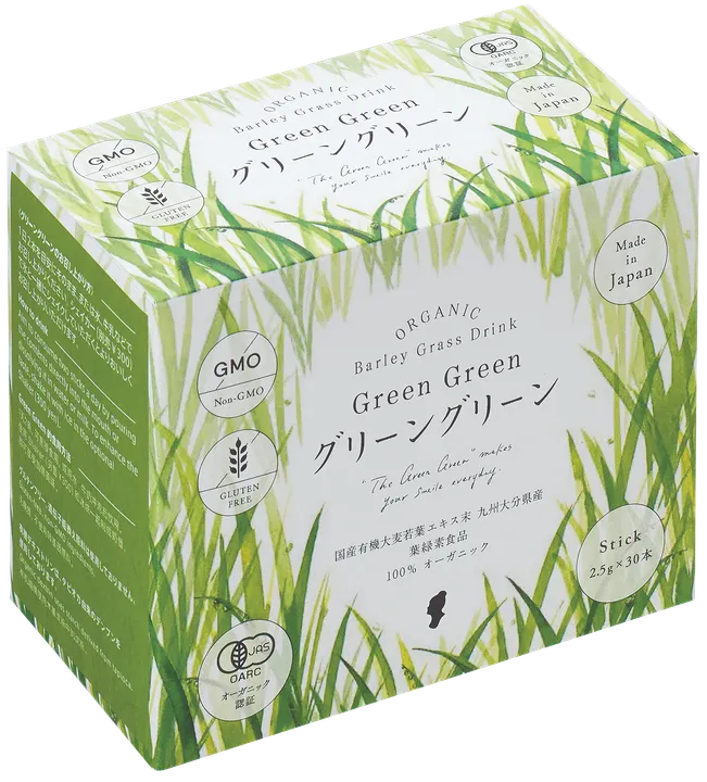 国産有機の大麦若葉を粉末化した、100%オーガニックの葉緑素ドリンク グリーングリーンは収穫されたばかりの新鮮な大麦若葉をギュッと搾って青汁にした後、熱を加えず粉末化する、青汁の長期保存を可能とした「活性保存製法」で作られています。 大麦若葉「赤神力」の健康パワーを最大限に引き出した、こだわりの製法です。 青汁が私たちにもたらす効果って? 健康的な生活を送るための基本は毎日の食事にあります。 1日350g以上の野菜(健康日本21における1日の目標摂取量)を摂取することが理想とされていますが、それだけの野菜を毎日食べ続けるとなると大変です。 最近では野菜そのものの栄養価も低下傾向にあり、十分に食べているつもりでも野菜不足になりがちなのも事実です。 そういった野菜不足は健康面で様々なトラブルを引き起こす一因となります。 大麦若葉に限らず多くの緑葉野菜の栄養素を摂取するのには青汁がよいと言われています。 青汁とは「生の緑葉野菜を搾った汁」のこと。 新鮮な緑葉野菜をギュッと搾った汁を飲むことで毎日の健康に必要な栄養をサポートできます。