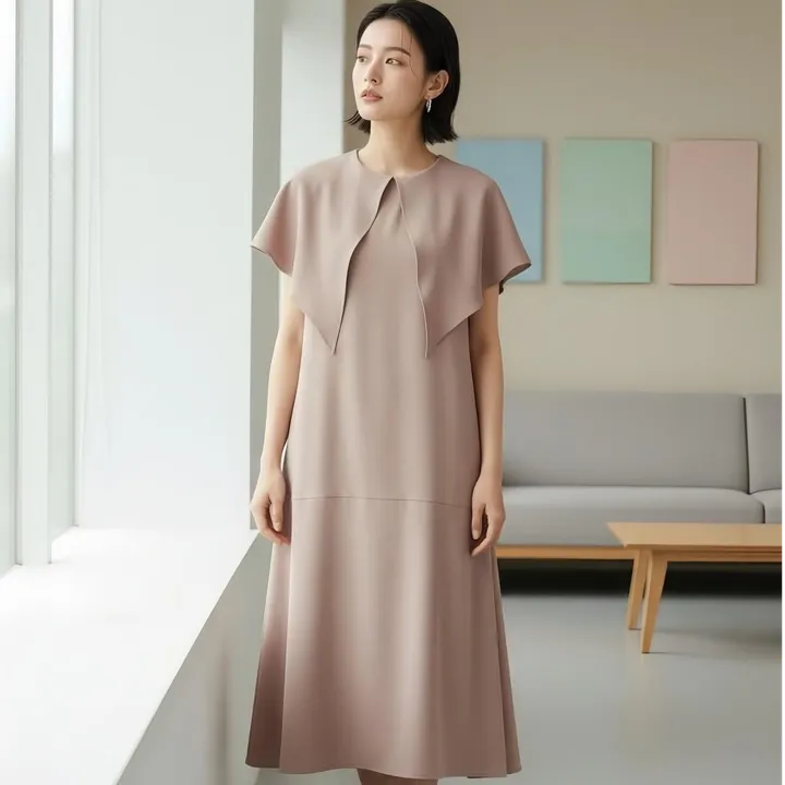 特徴 ケープ風の衿デザインがクラシカルな雰囲気を演出するノースリーブAラインワンピース。ゆったりと広がるシルエットで体型をさりげなくカバーし、両サイドに便利なポケット付きです。 生地 程よいハリと落ち感のある生地を使用し、シルエットをきれいにキープ。軽やかで動きやすく、春夏の装いにぴったりです。 シーン別コーディネート提案 【オフィス・オケージョン】一枚で完成する、気品漂うクラシカルスタイル ケープ風の襟が肩周りを上品に彩るため、アクセサリーがなくても華やかな印象に。 パンプスやパール系の小物を合わせれば、通勤はもちろん、ちょっとしたお食事会や行事にもふさわしい「きちんと感」のある装いが即完成します。 【旅行】シワを気にせず美しく。ポケット付きで機能性も抜群 ポリエステル100%の生地は、長時間の移動でもシワが目立ちにくく、旅行のパッキングにも最適。 両サイドにポケットが付いているので、旅先でスマホやチケットをサッと出し入れできるのも嬉しいポイント。フラットシューズやサンダルで軽やかに。 【カジュアル】カーディガン×スニーカーで、こなれた日常スタイル 襟のデザインを活かしつつ、上からカーディガンを羽織ったり、足元をスニーカーで外すことで、大人のリラックスカジュアルに。 落ち感のあるAラインシルエットが、歩くたびに美しく揺れ、デイリーな公園散歩やランチシーンでも「品の良さ」をキープできます。 単位(cm)モデル身長167cm サイズ FREE  着丈 113 バスト 100  素材:ポリエステル100%   中国製 透け感:なし 生地の厚さ:普通 光沢感:なし 裏地:なし 家庭洗濯:可能 【注意点】 ※撮影商品はサンプルの為、実際の仕様と異なる場合がございます。 ※画像の商品は光の照射や角度、お使いのモニター環境により、実物と色味が異なる場合がございます。スタジオ物撮りの画像が実物の色味に一番近くなっております。 ※予約商品の場合、お届け予定はあくまでも目安となります。 生産の都合上、お届け時期がずれる場合がございますので、あらかじめご了承ください。 ※表記サイズは商品の実寸です。 ※布製品の特性上、サイズ表の実寸法は多少の誤差が生じる場合がございますので、予めご了承ください。