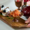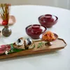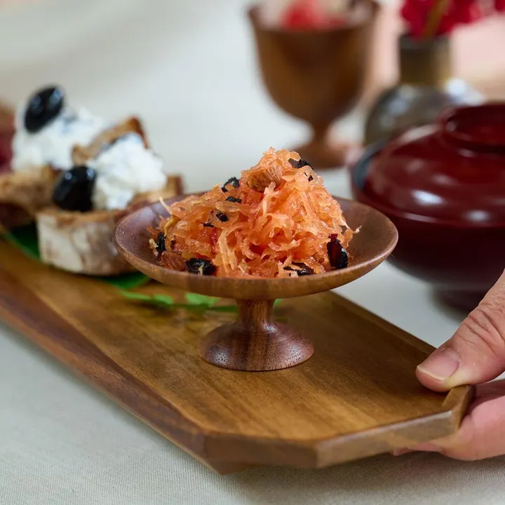 お正月のおせち料理や、クリスマスの特別な一品を、ひときわ上品に引き立てる木製の脚付き豆皿です。和の趣と洋のテイストを兼ね備えているため、様々な食卓シーンで活躍します。わずかに設けられた脚が、豆皿に上品な高さを与え、盛り付けた料理を一層美しく際立たせます。天然木ならではの優しい手触りと、丁寧に仕上げられた滑らかな質感が、食卓に心地よさをもたらします。お正月には、おせち料理の縁起物を盛りつけ、クリスマスにはオードブルやディップなどを盛りつける。普段使いにはちょっとしたおつまみを盛りつけるなど、食事のアクセントとしてお使いいただけます。