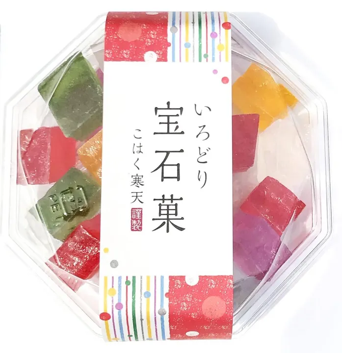 目にも鮮やかな宝石菓。琥珀寒天。 5種の果実風味の琥珀糖です。 マンゴー、ピーチ、ブルーベリー、スイカ、メロン味。 定番の一番人気商品です。 通年製造です。