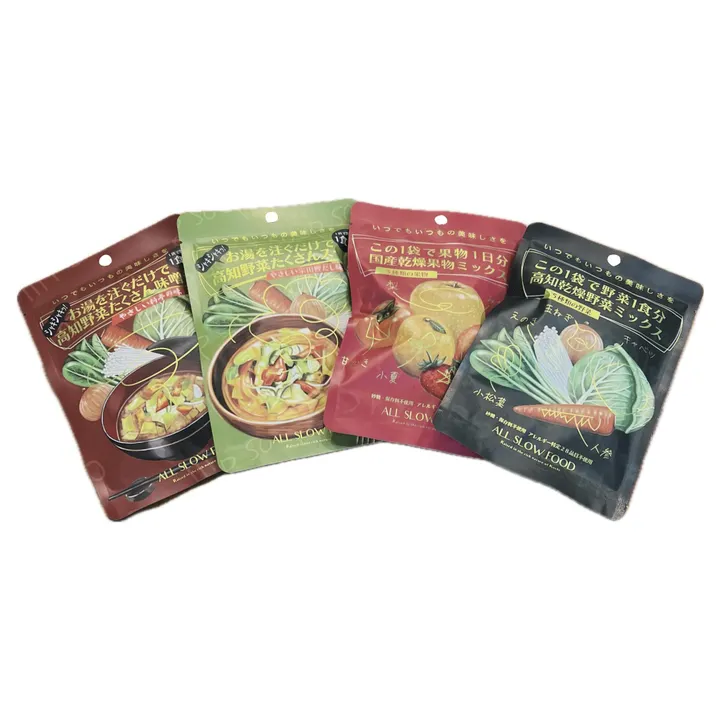 ALL SLOW FOODの現品サンプル4品セット(各1個) ①1食分の高知乾燥野菜ミックス(6g) ②1日分の国産乾燥果物ミックス(20g) ③お湯を注ぐだけで高知野菜たくさんスープ(10g) ④お湯を注ぐだけで高知野菜たくさん味噌汁(14g) 【商品詳細】 ①ゆっくり低温で乾燥させた野菜は、旨み・風味が強く美味しく仕上がっています。高知県産の野菜5種類(キャベツ、人参、玉ねぎ、小松菜、えのき)をバランスよくミックスしています。「生より美味しい」シャキシャキ食感のしっかり味の旨み野菜が食べられます。 ②ゆっくり低温で乾燥させた果物は、旨み・風味が濃縮されています。高知県産を中心に果物5種類(みかん、小夏、梨、柿、苺)をバランスよくミックスしています。そのままはもちろん、飲み物やヨーグルトとの相性もgood。 ③1袋で1食分(約120g分)の野菜がとれる高知宗田節鰹だしを使ったやさしい和風スープ。 ④1袋で1食分(約120g分)の野菜がとれる上質な料亭味のお味噌汁です。 お湯を注ぐだけなので、忙しい時や外出先でも簡単につくれます。 野菜たっぷりで満足感のあるスープなので、夜食や小腹がすいた時、いろんな場面で美味しく活躍できます。 ☆贈り物やギフトにも♪