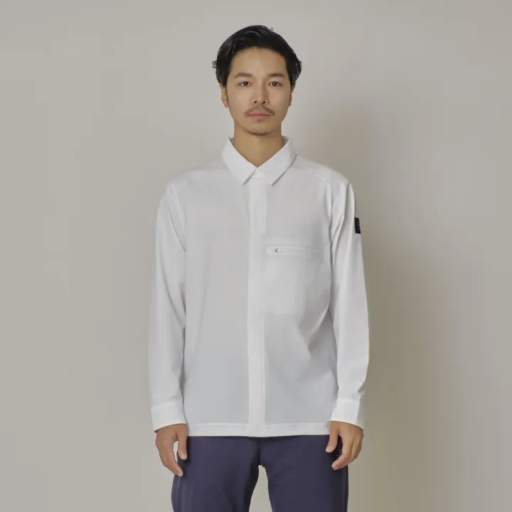 カジュアルにもキレイめコーデでも着用できる衿付きシャツ。 本格アウトドア用に匹敵する耐水圧と透湿性を備えた「BARRIER EFFECT.」によって水分含浸を防ぎつつ、衣服内の蒸れを素早く解消してくれる。 素材自体はもちろんの事、縫い目にも裏面からシームテープを貼っている為、縫い目からの雨や風の侵入も無し。 また、フロントやポケット部分、裾回りなど極力縫い目を表に見せないよう接着などでスッキリ見た目の仕上がり。 フロントあわせ部分と袖口カフ部分はドットボタン仕様で、左胸にはスマートフォンも入る止水ファスナー付きポケット付き。 突然の雨や少し肌寒い日の防寒着としても着用できる非常に使い勝手の良いアイテム。