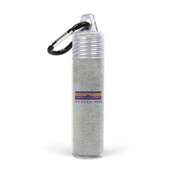 制菌防臭機能を備えたおしぼりタオルです。 繊維に付着させたプラチナの効果により、 水ですすぐだけで繰り返し清潔な状態で使用できるので、 キャンプや災害時の洗濯ができない時にも最適です。 高い保水性と速乾性の二面性があり、 ウェットでもドライでも使用可能です。 付属ケースはカラビナ付です。 Dリングや服にかけて持ち歩くことができます。 - プラチナ加工 繊維に付着させたプラチナの効果により、雑菌の繁殖が抑制されることで ウェットな状態でも一日中効果が持続し、清潔にご使用いただけます。 濡れた状態のイヤなにおい、放置臭の発生を防ぐため、快適にご使用になれます。