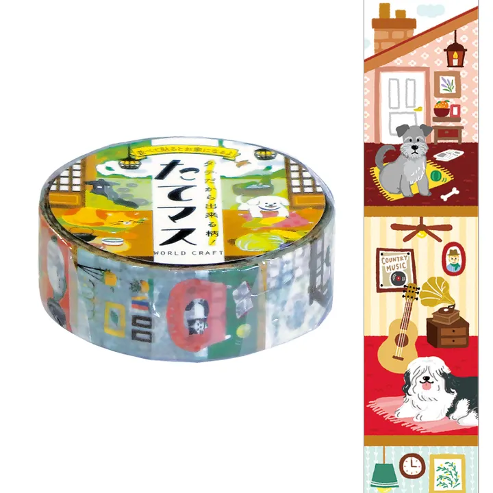 【たてマス おるすばん】 ◎並べて貼るとお家になる!?マスキングテープです。  縦柄だからこそ実現した、とあるマンションと古民家の階数ごとに続く柄です。 ◎お家を横から見たような絵柄が楽しめます。  さらに、お家を横に並べて貼ると柄がつながり、お家が完成するデザインになっています。 ---------------------------------------------------------------------------------------    〇 ● 〇 ● 〇 たてマス 〇 ● 〇 ● 〇 縦柄だから出来る、なが〜いモチーフや縦にデコレーション出来ることで 意味を持つ、"新しいタイプ" のマスキングテープ。 タテなことに意味がある柄を集めました。 <12柄展開> 縦長モチーフだから、従来のマスキングテープよりも たくさんの絵柄が中に入っています。 ※使用シーン画像には参考までに、「たてマス」シリーズの他の商品も掲載させて  いただいております。 <12柄一覧> ●FOOD … Pancake / Cheese / Diner / Seasoning ●FUN … 海底旅行 / 肩ぐるま / ウキウキ!フルーツ / 未確認飛行物体 ●DECORATION … つるし和飾り /キャットタワー / ひょっこり犬 / おるすばん