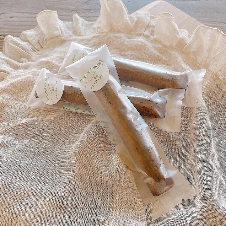▼内容量 米粉のお茶っぱフィナンシェ1個 フィナンシェサイズ: 25×145×20mm 袋サイズ:50×170×20mm