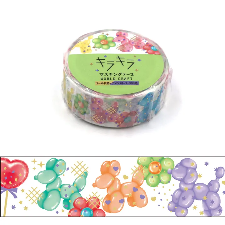 【 キラキラマスキングテープ 15mm Balloon party】 ★★ 箔を使用した、キラキラが可愛いキラキラマスキングテープ 〜 第8弾 Sparkling,Memory,Fancyの3つをテーマに <12柄> を揃えました ★★ バルーンアートをモチーフにしたデザイン。 ゴールドとアメジストパープルの箔がおしゃれ! 切って手帳の枠にデコレーションすると予定のなかった空白の日もかわいく埋めることができますよ♪ 『ゴールド箔とアメジストパープル箔』 を使用しています♪