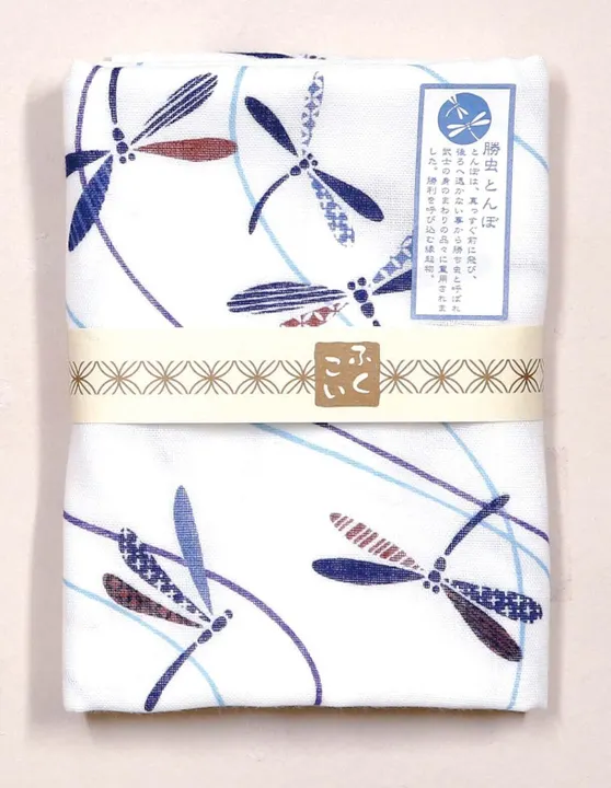 ふくこい ふんわり二重ガーゼ手拭い 「とんぼ」 タイトルの「福来い!」にちなんで、縁起の良い柄を集めた手拭いです。ふんわりとした肌触りや吸水性の良い、二重ガーゼ素材を使用。安心の日本製です。 「勝虫とんぼ」とんぼは、真っすぐ前に飛び、後ろへ退かない事から「勝ち虫」と呼ばれ、武士の身のまわりの品々に重用されました。勝利を呼び込む縁起物。
