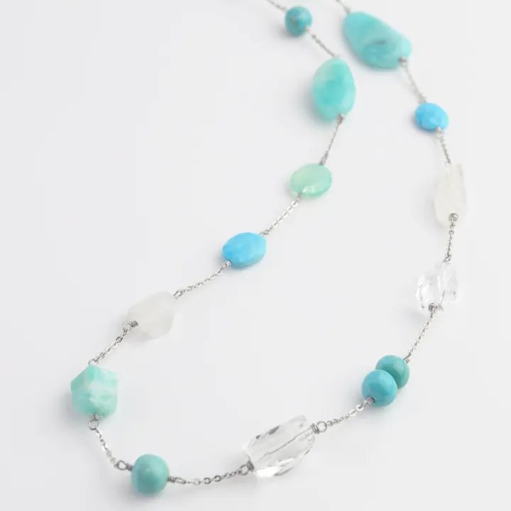 シルバー925、ステンレス(チェーン)、合金(金具)、アマゾナイト、ターコイズ、ブルーカルセドニー、ロッククリスタルクォーツ、レインボームーンストーン