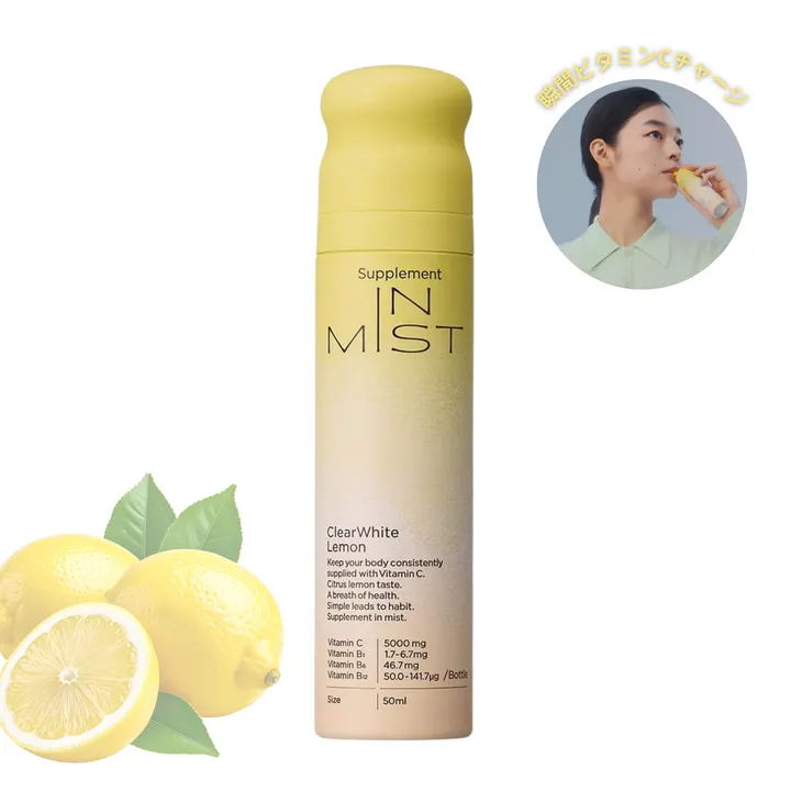 この商品について 🍋サントリー発ベンチャーが開発。 🍋どこでも水無しワンプッシュでおいしく飲めるミスト型サプリメント。ワンプッシュ1mlで1日分のビタミンCとビタミンB群(B1、B6、B12)。シトラスレモンテイスト。 🍋美容・健康に不可欠なビタミンCを1秒チャージ。ミストだからこそ吸収されやすく、とても効率良くビタミンCを摂取できます。 🍋IN MISTは、栄養をミスト状にして飲む新形態のサプリメント。水なしで、いつでもどこでも飲めて、ジュースのような美味しさだから「毎日飲めて、サプリメント習慣が長続き」。 🍋たった1秒で1日分のビタミンC(100㎎)を美味しく補給。ビタミンCは数時間でカラダから流れ出してしまう成分。1度に大量に摂取するより、こまめに摂取する方が効率が良いことが科学的に証明されています。 🍋ClearWhite Lemonは、そのメカニズムに着目し、いつでもどこでもビタミンCをチャージできるよう開発されたミスト型サプリメント。手軽でおいしい美容ルーティーンを体感ください。 🍋内容量:約50回分(約25日分) ※1日2回目安 ✨🎉権威ある賞を多数獲得しています🎉✨ IN MISTは、革新的な形態と継続的な価値が評価され、数々の権威ある賞を連続受賞しています。 ⭐日本サブスク大賞 2025: 「日本ネット経済新聞賞」を受賞! ⭐up PLUS 2025年 ベストコスメ: 読者アンケートに基づく「美容食品部門 第1位」に輝きました! ⭐2024年度 JAPAN EC 大賞: 「商品・サービス部門賞」受賞。 ⭐2023年度 グッドデザイン賞: 優れたデザインと機能性が認められました。 IN MISTは、美と健康への意識が高い20代〜30代の女性を中心に、幅広い層の方々にご支持いただいています。 お客様の声では、「吸収しやすいことと、水なしで飲めることが魅力的」「とても美味しく手軽にビタミンを摂れるので、継続しようと思う」など、継続しやすさと美味しさが評価されています。 さらに、管理栄養士からも「場所を選ばず手軽に飲めるので、理想的なサプリメント」との専門的な評価をいただいています。 【こんな方におすすめ】 ☑忙しくても手軽にケアしたい方 ☑錠剤やドリンクタイプのサプリが苦手 ☑食生活が不規則で、ビタミン不足を感じている ☑持ち歩ける美容アイテムを好む ☑気分転換できる香りやデザイン性を重視する ☑継続しやすく、楽しみながら美容を続けたい方 ☑トレンドや新しい美容習慣に敏感な方 ・お取り扱い先 現在、EC・楽天・Amazon・全国のハンズ51店舗、蔦屋家電二子玉川店、高知 蔦屋書店、有名美容クリニックのECショップにてお取り扱いいただいております。