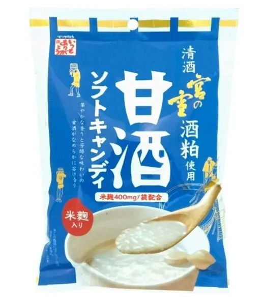 華やかな香りと芳醇な味わいの甘酒がなめらかに溶け合う歯につきにくいソフトキャンディです。 三重県にある老舗酒蔵の宮﨑本店が作る清酒「宮の雪」の酒粕を使用したコラボ商品です。 ゼラチンを使用しチューイング性と保型性を持たせています。また、溶けにくい&べた付きにくいので通年販売が可能です。 ※この商品にはアルコール分は含まれていません。 ※春夏パッケージです。