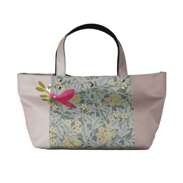 横長舟形の2WAYトートバッグ。 3ブロックに分けてベージュ、ブルー、アイボリーの3色で染色しています。 中央部は2種類のレトロフラワー柄を両面に分けて、青い鳥と赤い鳥をそれぞれにデザインし、柔らかい配色と女性らしいやさしいエレガントさを出しています。 開口部は中央にホックをつけていますので荷物の少ないときはそれで止めて、荷物の多いときは中身を隠すために20cmのオープンファスナーを閉めて使ってください。 ハンドルも3色をプリントしたハンドルでこだわりがあります。 また38㎜の太ストラップをつけていますのでハンドル下につけて、斜め掛けにも対応できます。 オープンファスナーを閉めても開口部42cmありますので、左右に500mlのペットボトルも入ります。収納力は抜群でバッグ本体も300gと軽く、持ち手も広くとっていますのでワンショルダーとしても使えます。 シンプルになりがちなサイズのバッグですが、存在感のあるプリントがコーディネートの幅を広げてくれます。 バッグを開けると色遣いの多さと、幸せワードがデザインされたポケットが楽しい気分にさせてくれます。 ポリエステルの遮光スエード素材はインテリアファブリックで、幕やタペストリーなどに使われており、厚手で、強度もあり、水にも強く、汚れは中性洗剤などで拭いてもらえば取れやすい素材で、扱いやすいものです。 デジタル染色によるオリジナル柄は、パーツごとにデザインされており、ほかにないティピィカレン独自の方法で完成されたバッグです。 ファブリックバッグの良さを追求し、オリジナルパターンを生かし、可能な限り日本の素材を使い、丁寧な日本職人さんの縫製で、個性的で、高級感もあり、実用的なバッグを是非お試しください。
