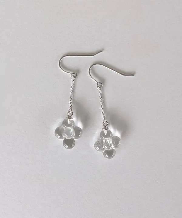 ガラスの小さな粒を用いて、春を感じる花々をモチーフに制作した商品です。四枚の花弁を持つ菜の花やワサビの花など、野山に咲き始める小さくて愛らしい花々は、私たちに春の訪れを告げてくれます。耳元でゆらゆらと揺れるたび、風にそよぐ花のように繊細な光を演出します。 素材:ガラス アイテム:ピアス:ステンレスフックタイプ(チェーン長さ約1.5㎝)     硝子size: 約10~15㎜ ※1点1点手加工で制作している為、色や形にわずかなばらつきがございます。あらかじめご了承ください。 ※接着剤は水に弱い性質があるため、入浴時などには外していただくことをおすすめします。