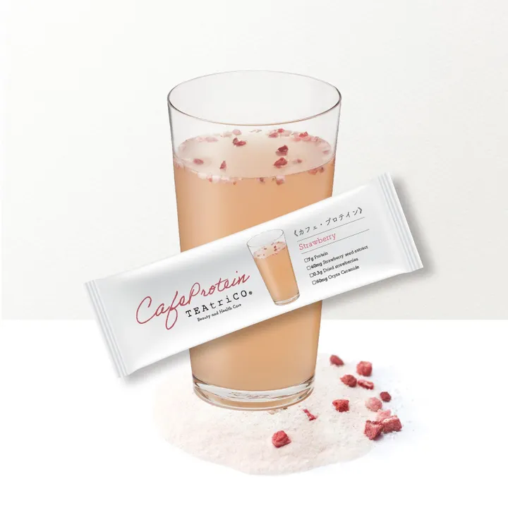 「明日のワタシにつながるブレイクタイム」 ティートリコのプロテインは、カフェメニューをイメージした抹茶ラテ・ほうじ茶ラテ・コーヒー・いちごの4種のフレーバーからお選びいただけます。 抹茶ラテ味にはドライ小豆、コーヒーにはドライバナナなど、それぞれのフレーバーに、フリーズドライのフルーツが入っていて、食べるプロテインとして楽しく続けられます。 個包装なので、持ち歩きにも便利です。 ジムでのワークアウトの後や、オフィスでのブレイクタイムにおすすめ。 気軽に美味しく、毎日の健康と美容をサポートします。