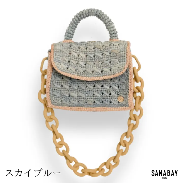 ☆ヴィンテージ風ですっきりしたラインのベーシックなラフィアバッグ、『 Félicie』 のミニカラーバージョン☆ 大きなチェーンを手首に絡めてアクセサリー風に持つ事もできます♡ 【色】パウダーピンク、フューシャ(濃いピンク)、スカイブルー、ラベンダー、    ナチュレル&ラベンダー(チェーン)、ナチュレル&ノワール(チェーン) 【サイズ】 縦11.5cm×横14cm×幅5cm  【内部】 裏地無 ストラクチャードバッグ、マグネット式ボタン それぞれ本体と同じ色のラフィア製のストラップ付( 取外し可・長さ調節不可) 【素材】〈本体〉: 天然草木 - ラフィア 〈金具〉: ニッケルフリー真鍮 【デザイン企画】フランス(パリ) 【製造】〈本体〉: マダガスカル(かぎ針編み) 〈金具〉: フランス、ヨーロッパ ※ 本製品は 天然材料を使用し一点ずつ職人によって手作りされるため、見本とは色合い・テイスト・形・サイズ等に微妙な違いがでる場合もあります。また天然素材のラフィアの性質上、ラフィア繊維のつなぎ目が時々現れる場合もございます。 ※ ご利用のパソコン、モニター環境によって画像の色味が異なって見える場合がございます。 以上の点につきまして予めご了承下さいませ。