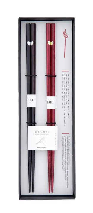 “初膳夫婦箸セット”にニューモデルが仲間入り! ハート、リボンモチーフと上品な風合いはそのままに、お箸の長さや形など細かなところをアップデートしました。 シンプルで使いやすく、値ごろ感のあるギフト箸として人気の“初膳”。 お陰様で発売開始から12年以上のロングセラーになりました。 実は弊社のギフト箸セットはここからスタートしました。 当時は箸のモチーフにハートとリボンは、かなり攻めたデザイン。 しかしながら時代の変化もあり、この度かねてよりお客様にいただいたお声を形にいたしました。 使い勝手の観点からも手の大小を問わず使いやすい23cmに統一し、手馴染みの良い五角箸に。濃茶、赤、無垢とカラーバリエーションを一新しました。 ちなみに五角形は「五徳~仁・義・礼・智・信~」を象徴し、理想の道徳や人格を表す形です。 そんな由来から『福を呼び込む縁起物』として親しまれてきた五角箸は、贈る相手の幸せと家内安全を願うギフトとしてぴったりと言えます。 台紙は明るく上品な“のし”入りにアップデート、英語表記の説明書きも付いています。 日本らしく軽くて持ち帰りやすいお土産品として、海外からのお客様にも注目されています。
