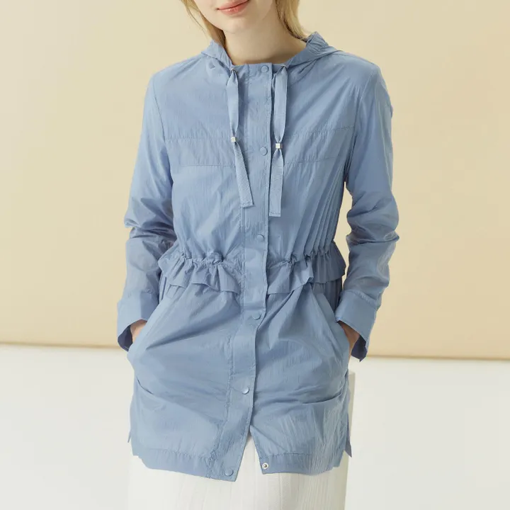 ・ストリング付きのフードで、シーンに応じて便利に使用可能 ・女性らしいAラインで、膝上の程よい丈感 ・ウエスト内側のストリングとストッパーで多彩なスタイル演出が可能