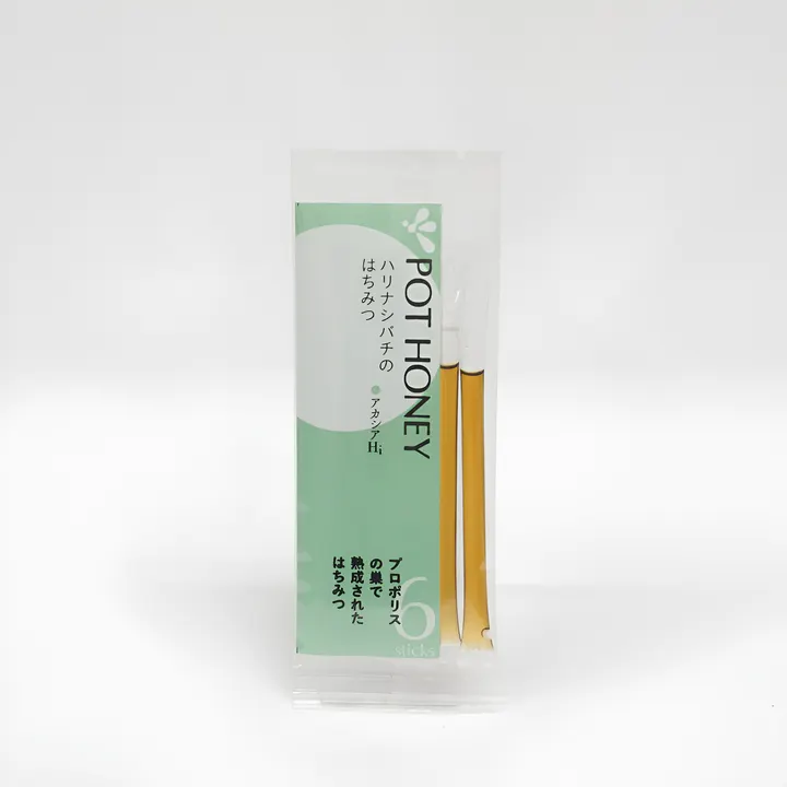 POT HONEY 百花蜜のスティックタイプ、6本セットです。 内容量はティースプーン1杯程度の2.3g。 (マレーシアで推奨されている1回の摂取量5~8gに比べると少なめです) 開封用の切込みがありますので、簡単に手で開けられ、お出かけの時でもさっと使えます。 紅茶に、お水に、サラダやヨーグルトにかけてお使いください。 日本ではまだほとんど知られていない、熱帯特有のハリナシバチの蜂蜜(マレーシア産)です。プロポリスが自然に溶け込んだ甘酸っぱいハチミツです。 マメ科の樹木、アカシア・マンギウムの植林地で採蜜された蜂蜜です。 甘みと酸味の両方がしっかりと感じられ、乳酸菌飲料のような甘酸っぱさがあります。時間の経過に伴い、ややハーブのような風味が出てきます。 実はこちらの蜜は、花の蜜ではなくて、アカシアの葉の根元の「花外蜜腺」から出る蜜をハチが集めたもの。甘露蜜といわれます。非加熱濃縮により、ハチミツ本来の成分を損なわずにややトロリとした質感になっています。 他のポットハニーに比べると流れにくいので、パンなどにもお使いいただけます。 (自然のものですので製造ロットによって多少の風味の違いがあります) ※2枚目の写真は他のサイズとの比較のためのものです 蜜源:アカシア・マンギウム(マメ科)ほか ハチの種類:Heterotrigona itama