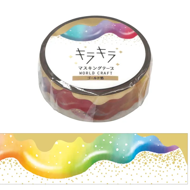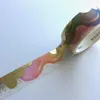 【 キラキラマスキングテープ 15mm Colorful puddle】  ★★ 箔を使用した、キラキラが可愛いキラキラマスキングテープ 〜 第4弾  Aqua,Decoration、Fruits の3つをテーマに <12柄> を揃えました ★★ カラフルな色が溶け出してキラキラのゴールド箔と絶妙にマッチ! 鉛筆やノートや箱の端に貼ったりデコレーションが楽しくなるデザインです♪ 『ゴールド箔』 を使用しています♪
