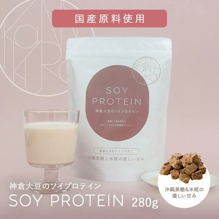 鳥取県三朝町(みささちょう)神倉(かんのくら)で古くから守り継がれてきた幻の地大豆「三朝神倉大豆」で作った国産原料のみを使用した国産のソイプロテインです。 三朝神倉大豆のほか、国産の黒糖粉末(さとうきび)、米糀、食塩のみで作られており、人工甘味料、保存料、着色料、香料、防腐剤を一切使用しておりません。 そのため、大豆の栄養をそのまま、安心して美味しく召し上がっていただけます。 また、動物性原料を使用しておりませんので、ヴィーガン、ベジタリアンの方にも安心してご利用いただけます。 自然な優しい甘みは水や牛乳、ヨーグルトなどとも相性がよく、また超微粉砕することで溶けやすくなっておりますので、日常的に手軽に美味しくお役立てください。