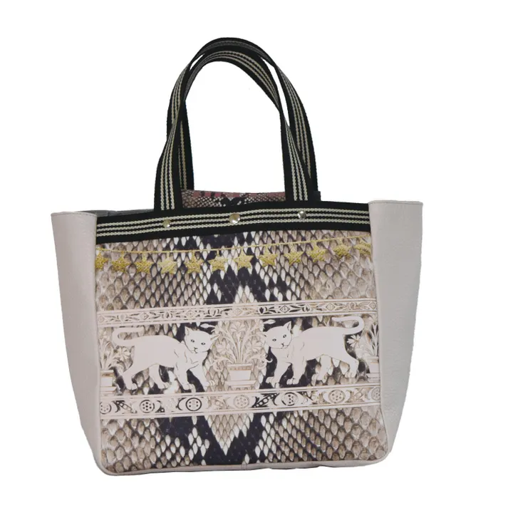 ティピィカレン牛革フラップ付きスネーク柄トートバッグ。 遮光スエードにスネーク柄で染め、片面には、スネーク柄に壁画風レース柄の猫を、もう片面には、犬柄で★柄テープ風なモチーフをデザインしカジュアルなエッセンスをプラスしました。 3本ラインのテープもカジュアルの中でも落ち着きのあるコーディネイトができます。 優しい薄いピンク色で、傷のつきにくい牛革のシュリンクは高級感もあり、両面にジラフ柄の遮光スエードが本物感を出しながら高級感をプラスしています。底マチも広くいっぱい入るデザインですので、中の荷物を少しでも隠せるようにフラップをつけています。マグネット止めで、ワンポイントにHELLOロゴをプラスしてます。 裏地はコットンで切ポケットを2個付け、幸せワードデザインし楽しくなるバッグを目指してます。 全体の重さは380gでとても軽いバッグです。 素材やパーツなどもこだわり、プリント、縫製もこだわりながら、日本製で丁寧な仕上がりです。 両面の印象が変わるようデザインを変えて、どちらの面を気分で使い分けしたくなる楽しさがティピィカレンバッグの特徴でもあります。 ファブリックバッグの良さを追求し、革素材、オリジナルテープを使い、個性的で、高級感もあり、実用的なバッグとして是非お試しください。 デジタル染色加工仕様