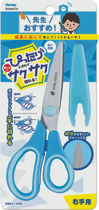 【学校の先生と共同開発した学童用はさみ】 お子様の指にぴったりフィットするように設計された子供用はさみ。 人間工学データを元にハンドルを設計し、低学年から高学年までストレスフリーで使用できます。 ハンドルには入れる指の名前を表示して正しい持ち方をわかりやすく学習。 のりが付きにくい独自の溝付きブレードで小さなお子様でもサクサク切れます。 刃先は安全な先丸仕様で、切れ味が長続きしやすい二段刃加工。 安全キャップ付、名前シール付(2箇所)、竹ひごきり付。 キャップに表裏の向きが無くはめ間違いがなく安全です。