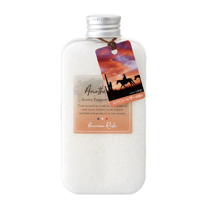 アナザートリップ・・・【もう一つの旅】をコンセプトに世界中からバスソルトを集めました。 アロマパスポートは各国の原産の塩に、それぞれの国をイメージする香りをつけました。 バスルームから世界へ・・・香りで旅するバスソルトシリーズです。 ・アメリカン ロデオ  北アメリカの岩塩層を掘削し、溶かして濾過して再結晶した岩塩を使用。  カウボーイのシルエット・・・スパイシーレザーの香り